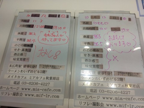 営業時間 ●ミアカフェ東京店(メイドカフェ)http://www.mia-cafe.com/ ● □平日 月~金 17:00~22:00 □土曜・日曜・祝日 12:00~22:00 ★定休日 なし(2019年1月より定休日廃止) □ラストオーダー 閉店の60分前  22:00閉店の場合→21:00ラストオーダー 営業日や出勤状況についてはこちら。 http://pandaland.cutegirl.jp/mif/c_cms_csv/sch_top.php ●ミアリラ&フォト東京店(撮影会&リフレ)http://www.mif-lr.com/ ● □全日 12:00〜22:00 ですがリラクゼーション出勤スタッフがいる時間帯のみ営業です。 ★定休日は不定休(出勤スタッフがいる時間帯の営業) □最終受付 閉店の45分前  22:00閉店の場合→21:15(21:50迄に施術時間が終わるコース) ※高校生不可 ●深夜営業については、公式サイト右上の http://market.chu.jp/schedule1/sche37.cgi ミアグループ総合スケジュール(PC・スマホ) http://market.chu.jp/schedule1/sche37.cgi?dm=1 ミアグループ総合スケジュール(ガラ携帯) をご覧ください。告知日のみ営業となります。告知日以外は深夜営業いたしておりません。 深夜営業対象日 22:00〜翌朝5:00(L.O.4:00)