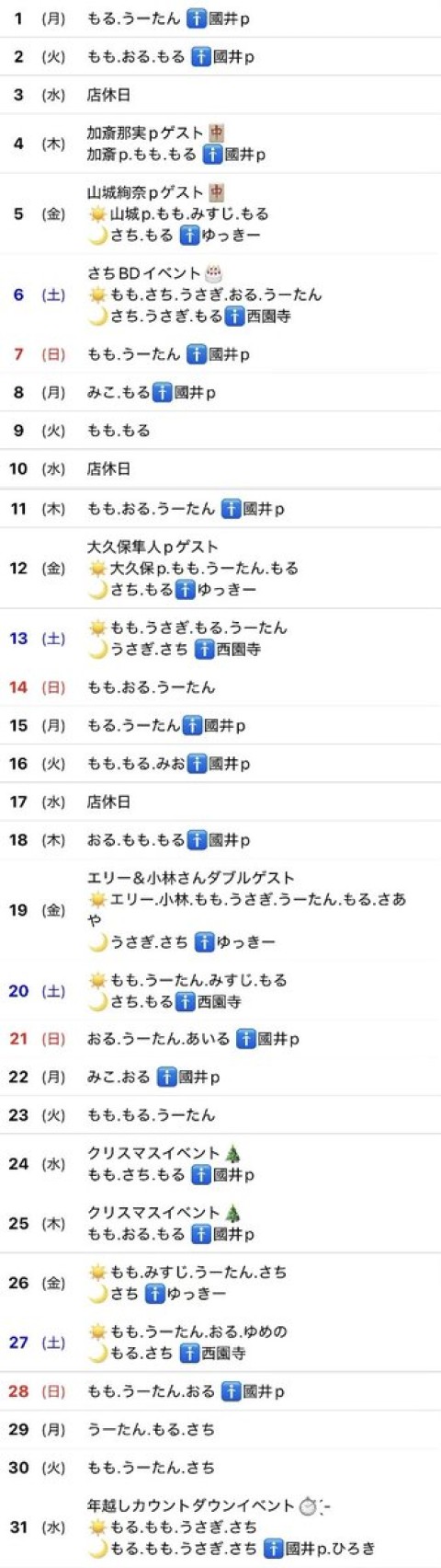 🎅🏻12月シフト表🎄 ⚠️追加、変更ある場合があるので当日のオープンツイートの確認をお願いします🙇‍♂️ https://t.co/1fY1F6MeO0