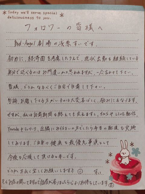 キャストからの御手紙です、当店はコロナ、うざいとか言ってますが、こういう思いのキャストもいます。
